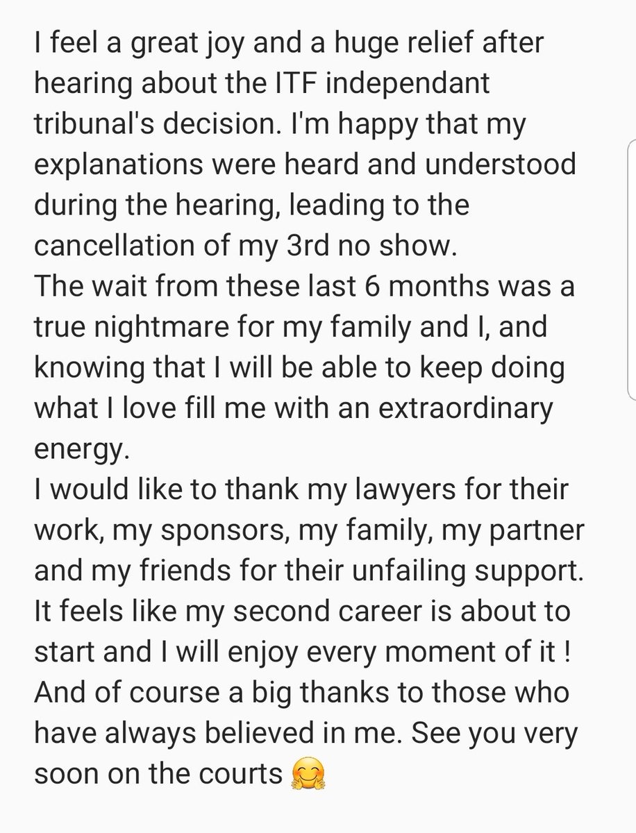 ITF:n asettama itsenäinen työryhmä katsoi, ettei dopingtestaaja ollut yrittänyt tavoitella urheilijaa riittävästi. He uskoivat Cornet’n esittämiä todisteita ja sitä, että hänet on testattu uransa aikana jo yli 100 kertaa ilman ongelmia.