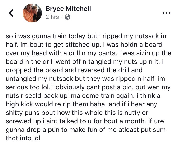 I have no idea how he has a sense of humor about this, but if @ThugnastyMMA doesn't get an underwear sponsorship out of today, there's something serious wrong with the world. I'm never touching a drill again.