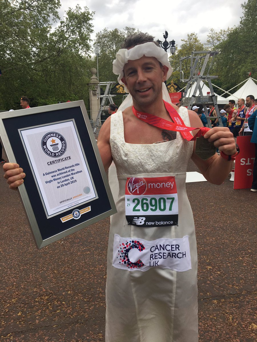 Lee Goodwin has taken back the record for the fastest marathon in a wedding dress (male) with a time of 02:49:17 for @CR_UK. Lee previously held this record in 2014. #LondonMarathon #GetInspired