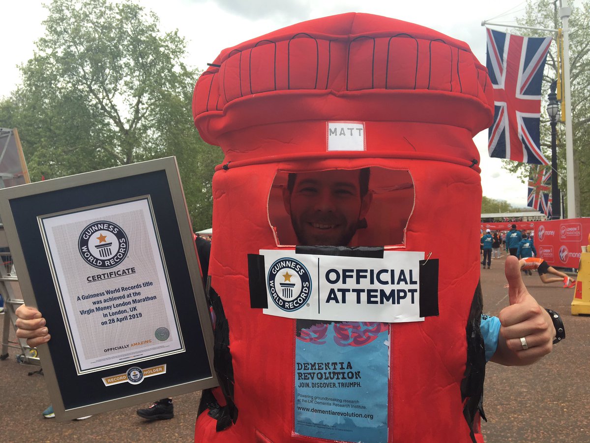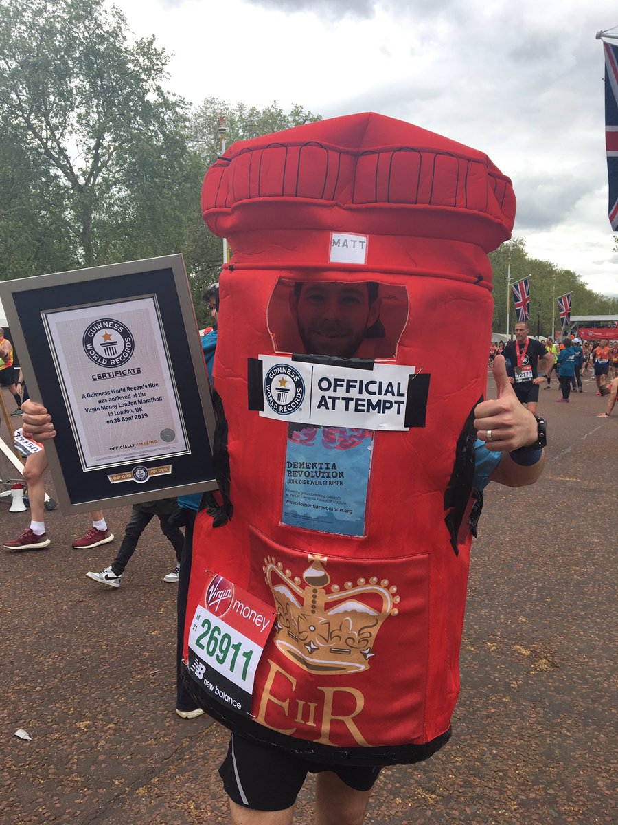 Matthew Collins has secured the record for the fastest marathon dressed as a post box (male) with a time of 3:14:32. Matt is raising money for @DementiaRev in honour of his uncle, who was a postman who suffered from dementia in his later years. #LondonMarathon #GetInspired