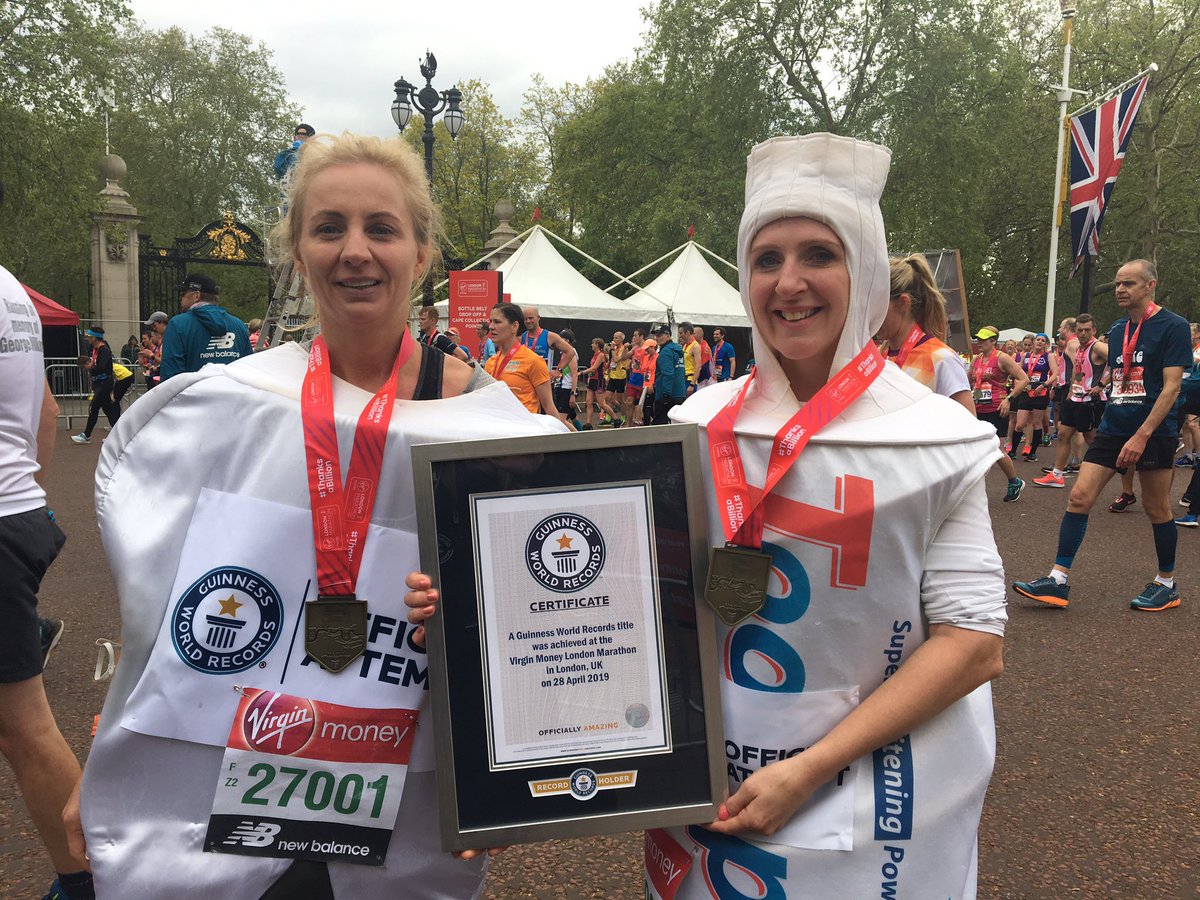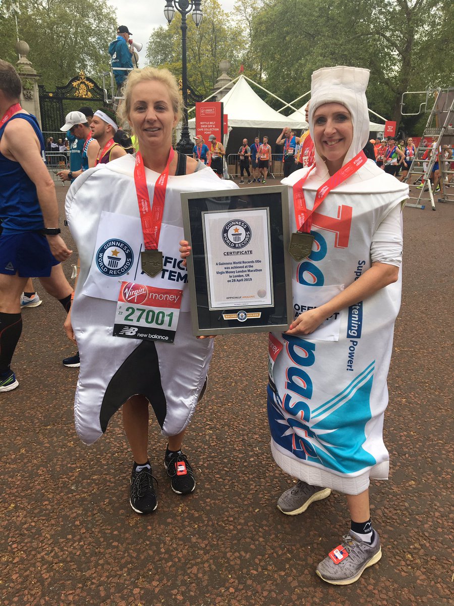 Congrats to friends Katie Simpson and Fiona May Beaty who ran the #LondonMarathon as a tooth and a tube of toothpaste for @DerianHouse. They finished in 3:51:17. Titles: fastest marathon dressed as a tooth (female) and fastest marathon dressed as a toiletry item (female)