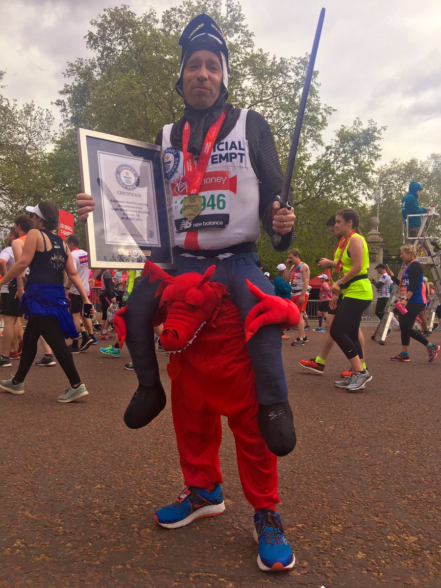 James Cook secured the record for fastest marathon dressed as a dragon (male) with a time of 4:46:50 while raising money for @Macmillan and Icthyosis Support Group. He tried to break this record last year but missed out by 1 minute and 13 seconds #LondonMarathon #GetInspired