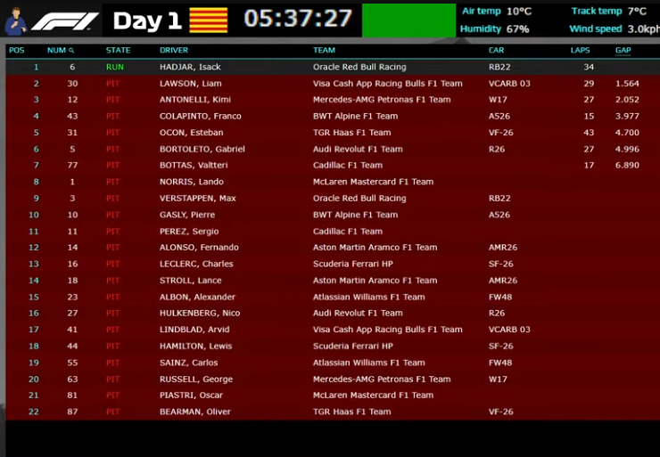 Tulokastalli Cadillacin Valtteri Bottas ajoi 33 kierrosta ja jäi Hadjarista lähes kuusi sekuntia. Vain Audin Gabriel Bortoleto jäi hänen taakseen.